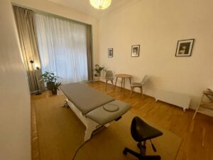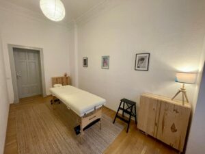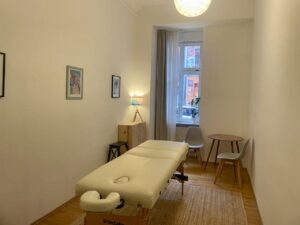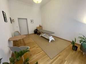 Designed as a holistic treatment space, offering flexibility for both table-based and floor-based work as well as consultations. It includes a foldable, removable massage table, two cupboards for storage during treatments, and a table with two chairs for consultation, allowing the room to adapt easily to different therapeutic approaches.