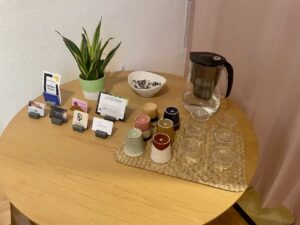 The waiting area is cozy and bright, filled with plants and arranged with comfortable seating for multiple clients. Filtered water and a selection of tea are available, creating a calm and welcoming space before and after sessions.